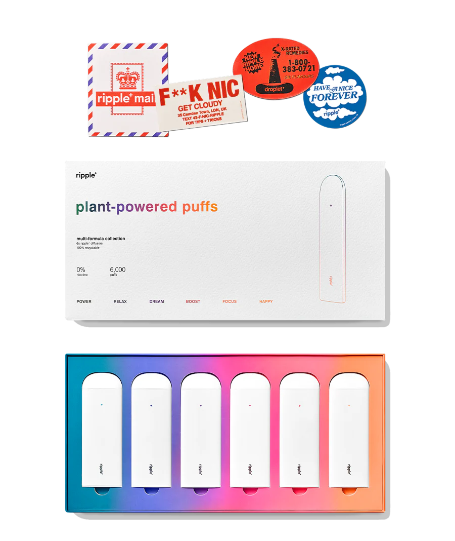 Hell no. Ripple+ is a portable aromatic inhaler which, is totally nicotine-free and non-addictive. Which, is why we’re here, doing our plant-powered thing! Our next-gen aromatic diffusers are designed to help with oral fixation by replicating that hand-to-mouth gesture associated with smoking. The difference? We don’t use nicotine; we use plant extracts and natural aromas to transport you to a puff-able, non-addictive utopia. Sweet!