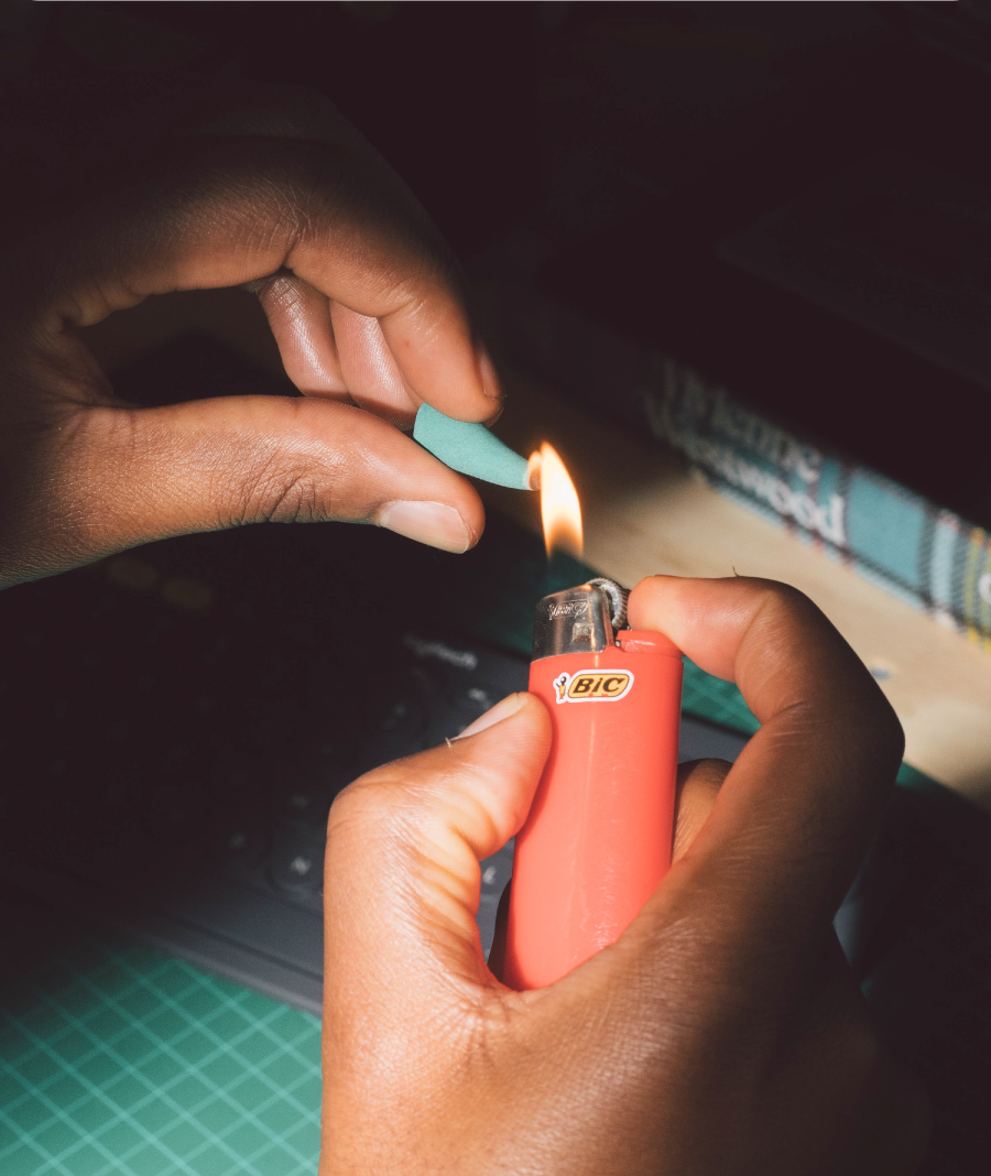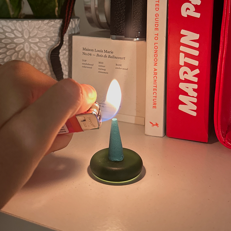 Place your droplet on top of the sea glass holder, grab your light, light the tip of your droplet and gently blow out after a few secs. Now, settle down & let the flame burn.