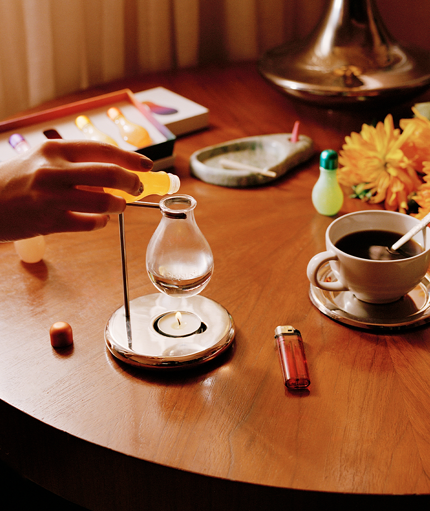 First, add water to your glass vessel then add 5-10 drops of your chosen aroma. Light the tea light below, and let the heat gently diffuse the fragrance oil throughout your space. Easy.