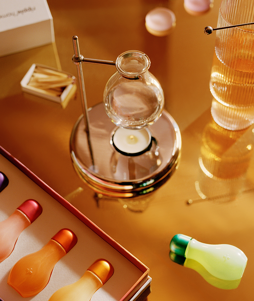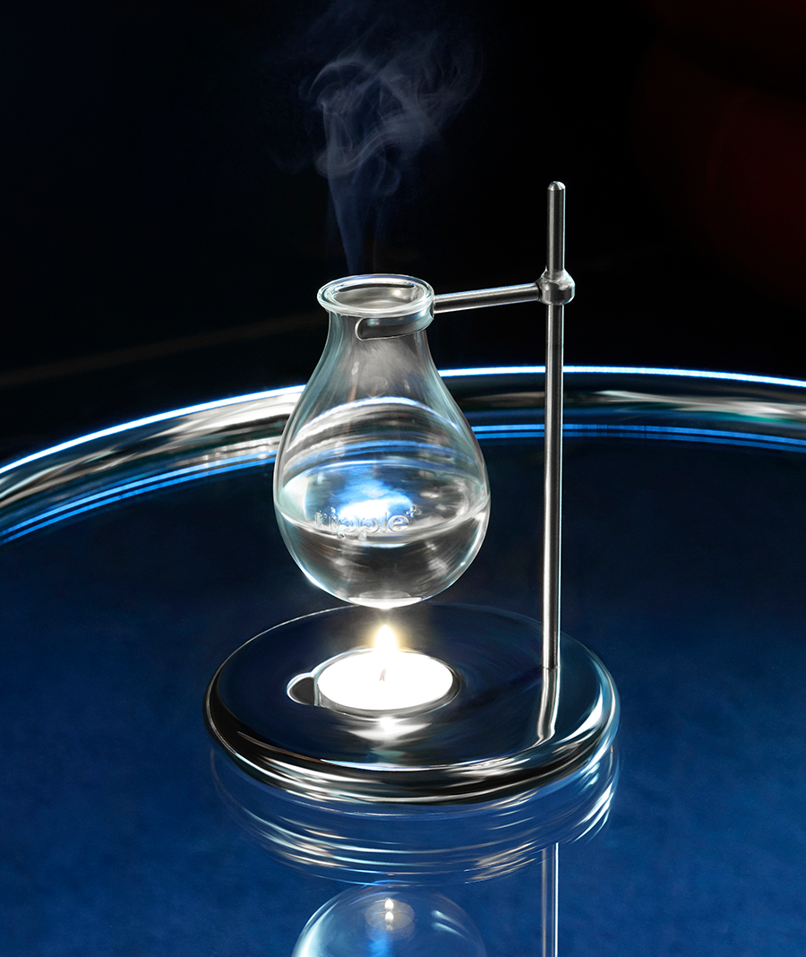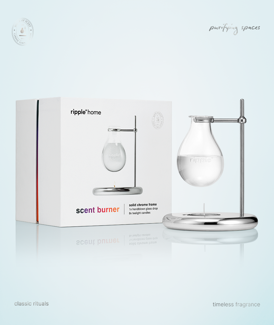 The scent burner is our latest take on modern aromatherapy, combining design and function. Designed to add a touch of character with a unique, yet simple design, this sculptural set features a handblown glass vessel, 1 soild chrome frame and 8 tealight candles. The scent burner uses heat from the tealight candles to gently release fragrance for a smooth & balanced diffusion. Pair it with our scented drops for the full therapeutic ripple⁺ home experience (drops sold seperately)